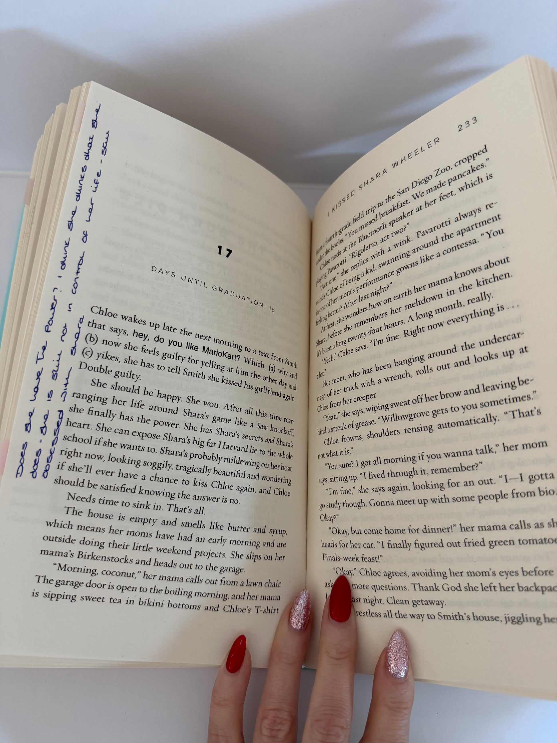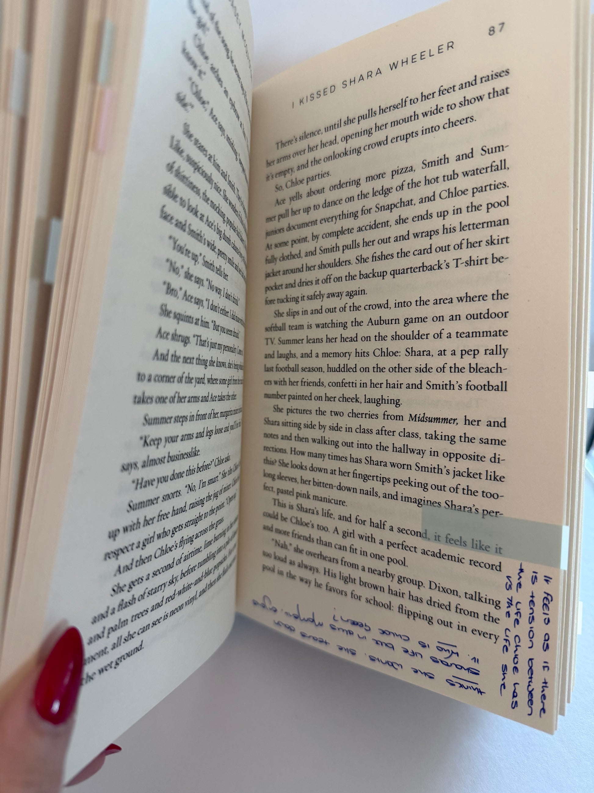 This is a ready-to-ship, fully annotated copy of I Kissed Shara Wheeler, read slowly and intentionally and filled with handwritten notes and themed tabs throughout.